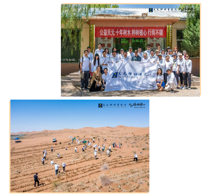 自2015年起,天元连续十年开展阿拉善腾格里沙漠锁边生态公益项目。十年来,累计超过500名天元律师参与种树活动,共栽种树木逾25000棵,通过扎草方格、挖坑、栽种、填土、浇水等一系列细致工作,为沙漠生态恢复贡献了力量。如今,十年前种下的花棒树已长至一人多高,在公益林中茁壮成长、迎风绽放,展现出持续的生命力和切实的生态成效。