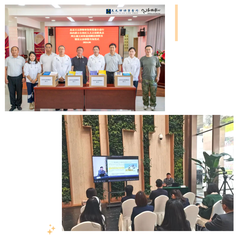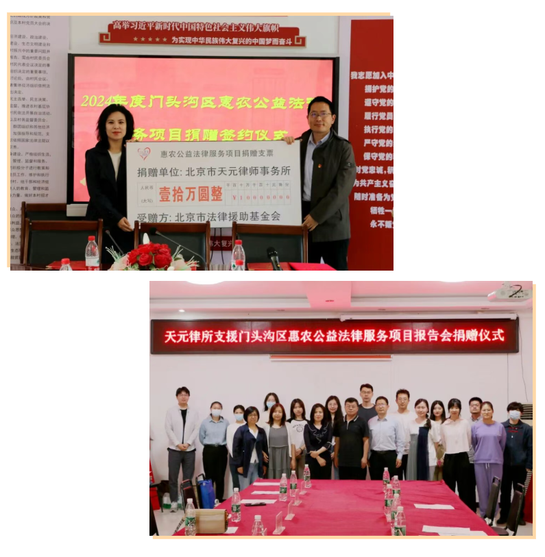 天元经北京市法律援助基金会的推荐,自2009年成为第一批支持北京市边远郊区公益法律服务的律所,15年来定向为门头沟区提供资金支持150余万元人民币,用于培训乡镇法律服务中心的公益志愿者,服务当地群众需求。天元还积极组织年轻律师走进农村公益法律服务站点,为当地群众送去专业的法律知识,定期提供法律咨询,为维护困难群众、弱势群体的合法权益贡献力量。