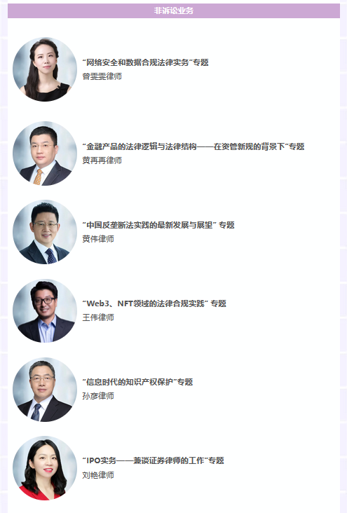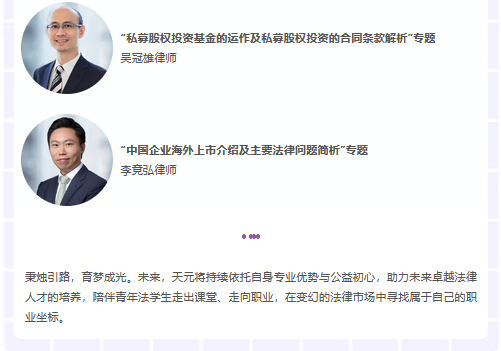 律师是众多法学院毕业生的重要职业方向。课程通过天元多位一线合伙人的亲身讲授,从诉讼策略到非诉结构,从思考沟通到文书写作,帮助学生跳出传统法学框架,建立商业思维、客户导向和系统解决问题的实务能力。今年在延续往年核心内容的基础上,进一步扩展至Web3与NFT法律实践、跨境数据合规、资管新规下金融产品设计等前沿领域,覆盖更多当下热点与业务蓝海。